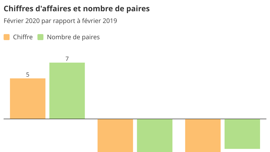 Il n'est guère pertinent de comparer les chiffres d'affaires de février 2020 avec ceux de février 2019. En effet, l'an dernier, février n'a représenté que 4,3% du chiffre d'affaires annuel. Si on réalise cette année 10% de chiffre d'affaires en plus ou en moins, cela restera marginal. Une moyenne de -4,2% pour le chiffre d'affaires et de -3,7% pour le nombre de paires vendues par rapport à février 2019 a donc beaucoup moins d'impact que ce qu'on ne pourrait penser à première vue.