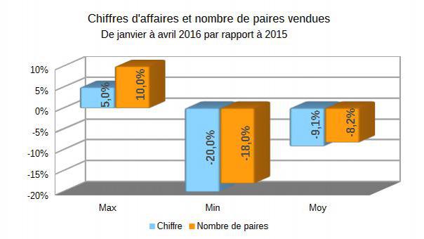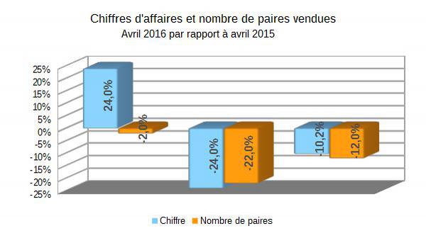 Avec en moyenne 10,2% de chiffre d'affaires en moins et 12% de paires vendues en moins qu'au mois d'avril 2015 (un mois relativement bon), on a du mal à trouver des 'circonstances atténuantes'.