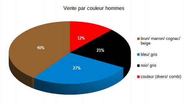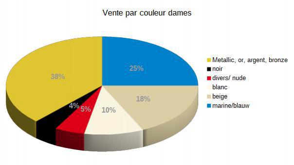 La palette de couleurs pour ce printemps est toutefois novatrice. Après plusieurs saisons d'absence, les couleurs métallisées reviennent en force chez les dames: argenté, doré, bronze et platine jouent les vedettes. Le bleu arrive en deuxième position. Chez les hommes, c'est le brun, le cognac et le beige qui dominent. Ici aussi, le bleu arrive en deuxième place. Les enfants optent pour une large variété de teintes, mais ici aussi, le bleu est une couleur dominante.