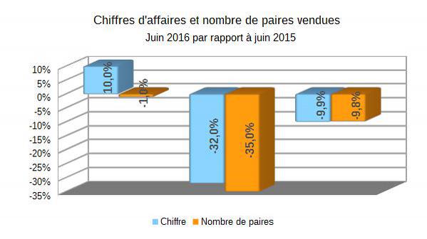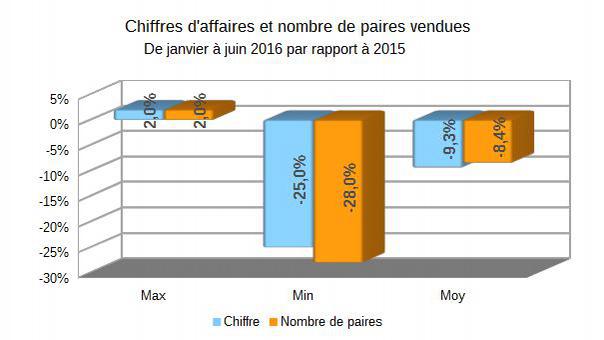 Pour l'ensemble du premier semestre 2016, du 1er janvier au 30 juin, on parle de -9,3% de chiffres d'affaires et -8,4% de paires en moyenne par rapport à la même période l'an dernier. A l'époque, la situation fin juin affichait à peu près un statu quo.