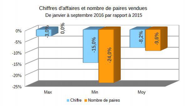Les huit premiers mois de 2015 ont été tout sauf superbes, avec une perte cumulée de près de 15%, mais septembre 2015 a représenté une excellente manœuvre de rattrapage", écrivions-nous l'an dernier. Hélas, ce scénario ne s'est pas répété. Fin août, nous avions une perte de chiffre d'affaires cumulée (de 7,3%), mais cette année, les résultats favorables se sont fait attendre en septembre. Au contraire, ce fut un scénario catastrophe avec une baisse moyenne du chiffre d'affaires de 28,5% et 28,3% de paires vendues en moins par rapport à septembre de l'an dernier. Les commentaires des commerçants ne mentent pas: une catastrophe, une saison pourrie, à nouveau un coup dur, bien trop chaud, un été trop long après les soldes d'été, la menace terroriste, les grèves, la pluie de licenciements, …". C'est affligeant!