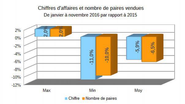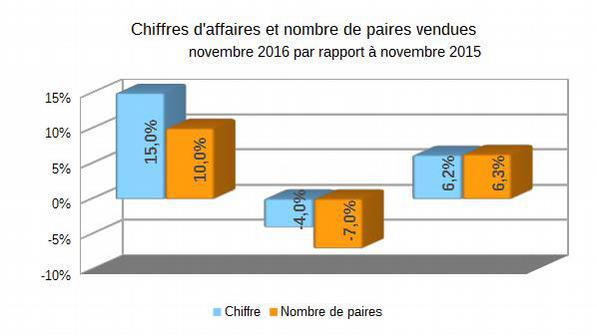 Après octobre, novembre 2016 fut également un bon mois de vente dans le commerce de détail de chaussures belge. Le chiffre d'affaires moyen a progressé de 6,2% et le nombre de paires a également augmenté de 6,3% par rapport à novembre de l'an dernier. Mais il ne faut pas crier victoire trop tôt: en effet, novembre est en moyenne le second mois le plus faible de l'année, en totalisant à peine 6,3% du chiffre d'affaires annuel (seul février fait encore moins bien avec 4,7%). Une hausse d'un peu plus de 6% n'est donc pas vraiment pertinente, mais cependant, cela donne du courage au citoyen. Les conditions climatiques en novembre étaient 'normales' dans tous les domaines d'après l'IRM: température, précipitations, tout a évolué selon les moyennes annuelles.