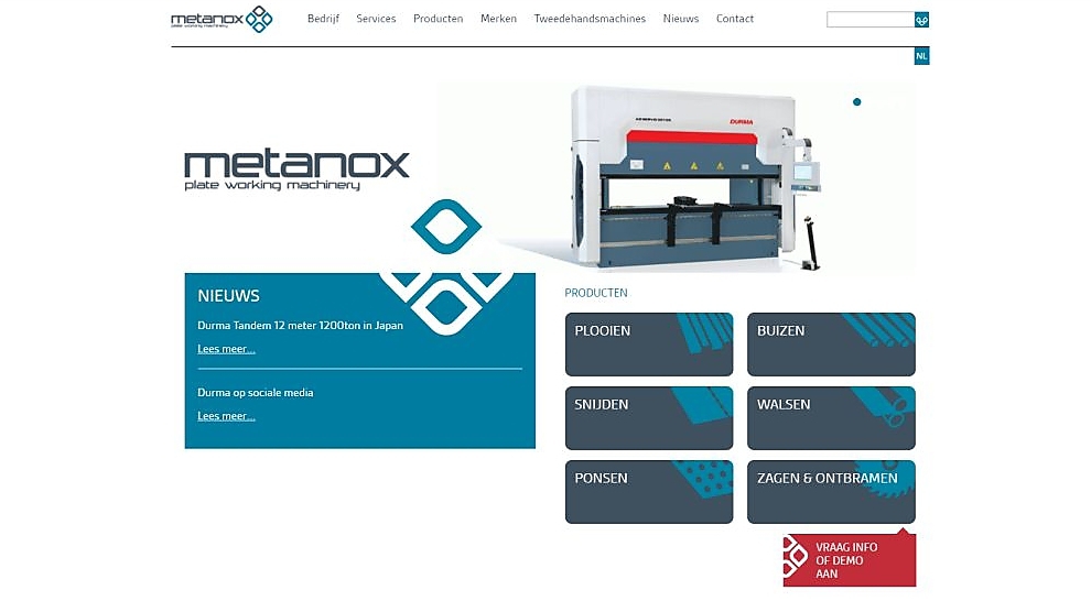 Begin september lanceerde Metanox zijn nieuwe website. Metanox heeft een zeer uitgebreid gamma aan plaatbewerkingsmachines en wil met de nieuwe website een volledig overzicht geven van de merken en types machines die ze in hun programma hebben. U kan ook doorklikken naar de website van de verschillende merken, catalogen downloaden, nieuwsbrieven lezen, het tweedehandse aanbod bekijken, … Beslist de moeite waard dus voor iedereen die in de plaatbewerking actief is om eens in te loggen op de vernieuwde website: www.metanox.be. In eerste instantie werd de nederlandstalige versie gelanceerd. De franstalige versie volgt later dit jaar.