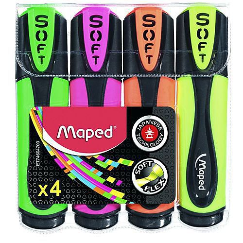 Het markeren van een tekst gaat erg soepel, maar toch uiterst precies door de Japanse technologie van de Maped Fluo Peps Ultra Soft markeerstiften. De overlijners hebben een zachte en meer flexibele beitelpunt die tijdens het gebruik, ook op minder vlakke ondergronden, perfect op het papier blijft. De aangebrachte markeringen van 1 tot 5 mm zijn helder van kleur in blauw, groen, oranje, roze en natuurlijk geel. Leverbaar per kleur of in een handig etui met vier kleuren.