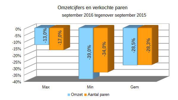 De eerste acht maanden van 2015 waren allesbehalve schitterend, met een gecumuleerd verlies van bijna 15%, maar september 2015 betekende een uitstekend inhaalmanoeuvre" schreven we vorig jaar. Helaas werd dit scenario dit jaar niet herhaald. Eind augustus zaten we ook met een gecumuleerd omzetverlies (van 7,3%), maar dit jaar bleven de gunstige resultaten in september uit. Integendeel, het werd een rampscenario met een gemiddelde omzetdaling van 28,5% en 28,3% verkochte paren tegenover september vorig jaar.