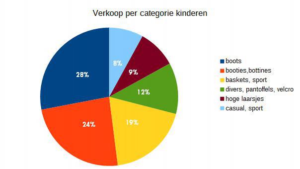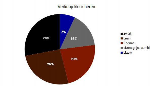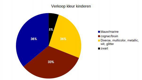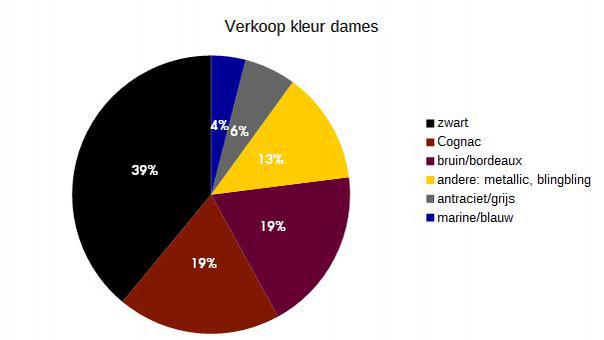 Juist als vorige maand maakten ook in november de klassieke kleuren en modellen de dienst uit. De dames kochten voor 80% de traditionele herfstkleuren zwart, cognac, bruin, bordeaux en grijs. Slechts een paar op de vijf week af van de standaard. Bij de heren hetzelfde verhaal: voor 77% zwart, bruin, cognac en aanverwanten. Bij de kinderen is er veel meer kleur in het spel: slechts 5% zwart, maar meer dan de helft van de paren was blauw, metallic, glitter en gecombineerd kleurrijk.