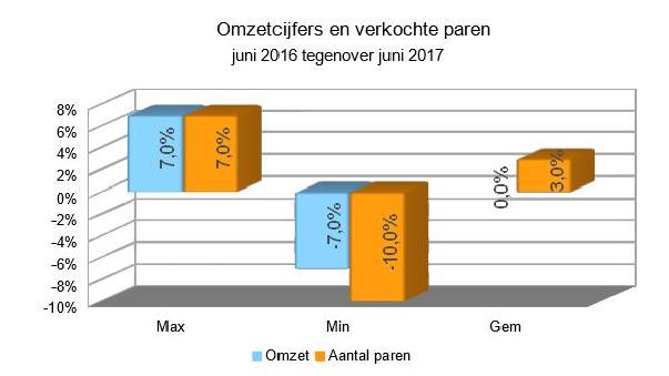 De temperaturen tijdens de maand juni 2017 lagen gemiddeld 3 graden hoger dan het langjarig gemiddelde. Het was een van de vijf warmste junimaanden sedert het begin van de waarnemingen, nu al bijna 200 jaar geleden. Toch heeft de maand juni 2017 niet geleid tot een omzetstijging ten opzichte van juni vorig jaar (status quo), het aantal verkochte paren daarentegen lag een stuk hoger dan vorig jaar (+4%) en daar zijn verklaringen voor. Juni 2016 was te koud en te nat (de natste juni sedert 1938!), juni 2017 was te warm en te droog. “De schoenenmannen klagen blijkbaar altijd, net zoals de boeren", zo stelt een collega.