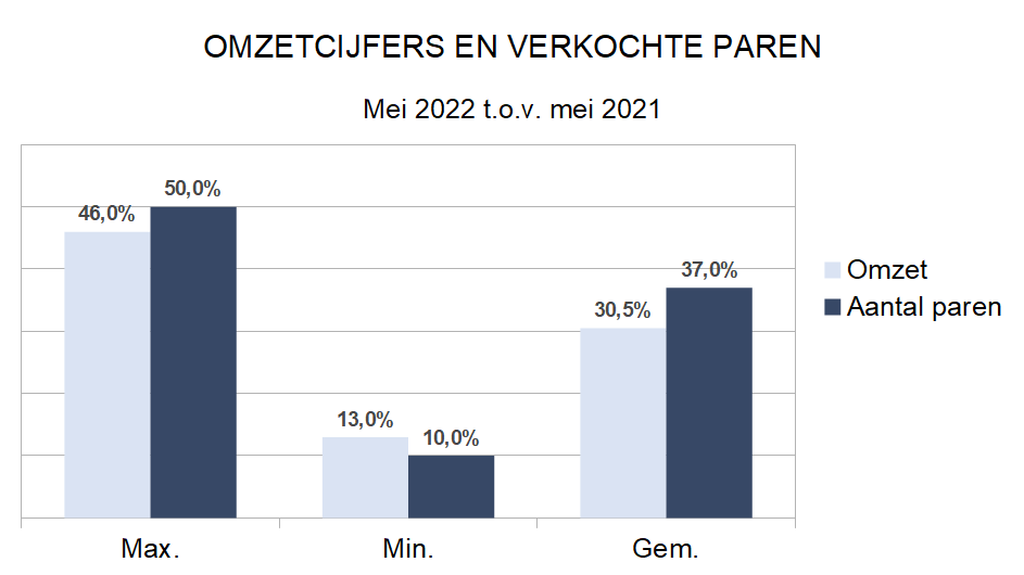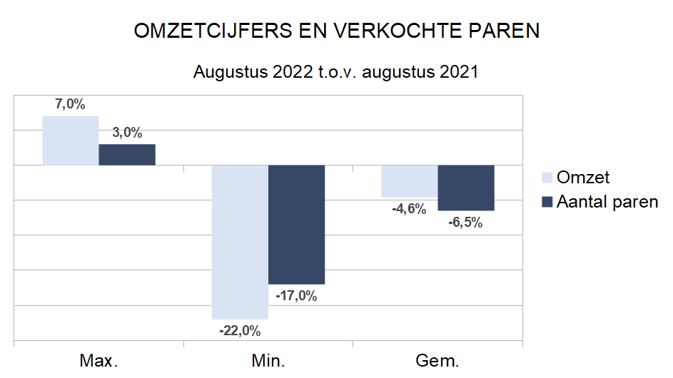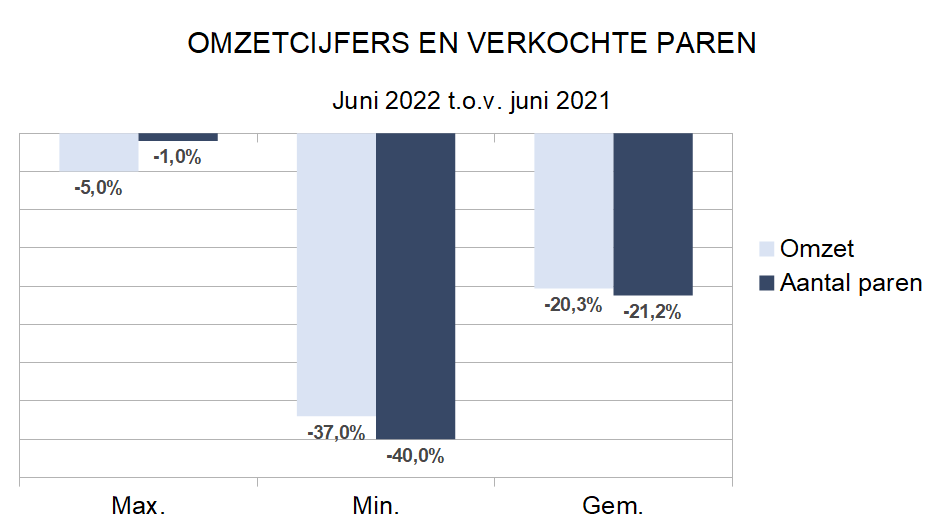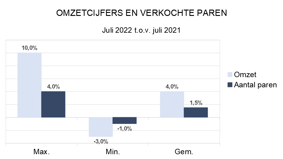 Tijdens de eerste zes maanden van 2022 werd gemiddeld 10,9% meer omzet geboekt en werden er 8,1% meer paren verkocht dan vorig jaar. Wie toch vergelijkt met 2019, kan vaststellen dat er gemiddeld 7,5% minder omzet werd geboekt.