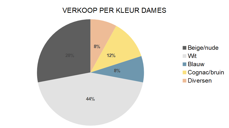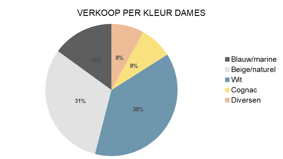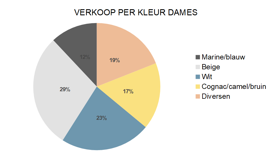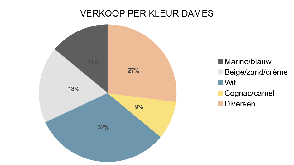 Net als in april is het kleurenpalet zomers te noemen: bij de dames zijn beige, sand, naturel en aanverwanten (28%), samen met wit (44%) goed voor ongeveer drie vierde van de omzet (72%).